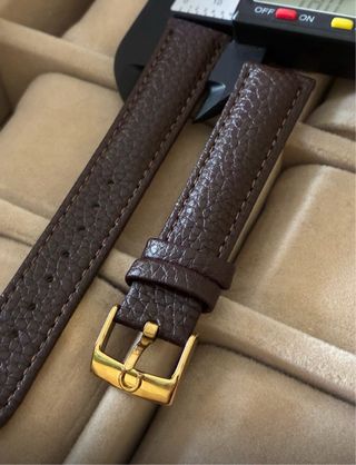 Correa de reloj de piel de becerro con un acabado texturizado y pespuntes a juego. - Medidas : 18mm - Material: Piel de becerro - Color: Marrón. - Cierre: Hebilla en acero inox oro