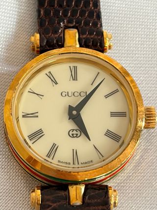 Elegante reloj Gucci de los años 80 con detalles en oro y correa marrón. - Diseño clásico y atemporal. - Caja y detalles en tono dorado. - Correa de piel en color marrón.