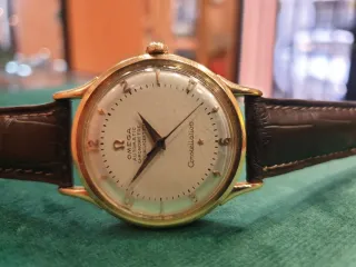 Reloj Omega Constellation de los años 50, con caja de oro y sistema de martillo. Un clásico de la relojería. - La esfera es totalmente original y está perfecta. - 35x40mm - Caja de oro. - Correa de cuero marrón.
