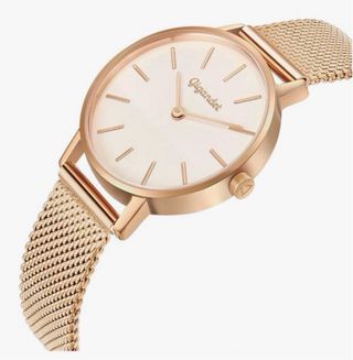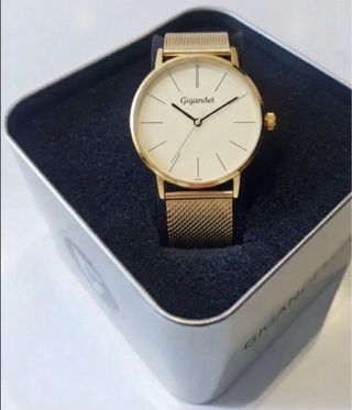 Elegante reloj Gigandet con un diseño minimalista y una esfera clara. - Correa de malla dorada. - Caja de reloj dorada. - Esfera blanca con detalles finos. La carcasa de acero inoxidable tiene un diámetro de sólo 30 mm. El reloj de las damas pesa 41 gramos. La esfera tiene el color blanco La caja de oro rojo está hecha de 100% acero inoxidable (316L). El brazalete Milanaise de color rojo-oro se ajusta perfectamente a cada muñeca. El reloj de las damas es impulsado por un movimiento de cuarzo Seiko, calibre VJ20.