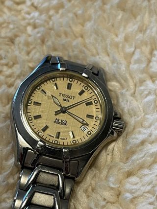 Reloj de pulsera Tissot PR100 de 1995. Un accesorio elegante con detalles en oro y plata. Para mujer - Esfera de color dorado. - Correa de eslabones plateados. - Resistente al agua hasta 100m/330ft. - funciona con Pila