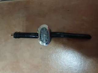 Reloj de pulsera con correa de piel negra. - Esfera blanca con detalles plateados. - Correa con acabado de cocodrilo. - Bisel plateado con números. No funciona, no sé si es solo la pila