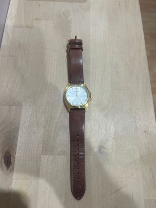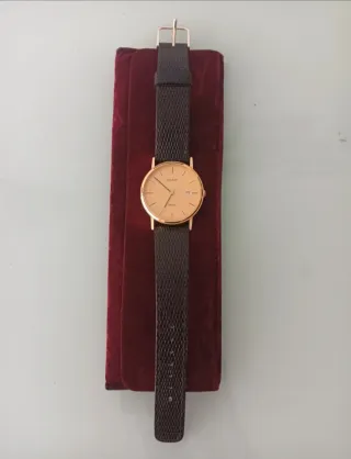 No tiene números, pero tiene presencia. Domi Quartz, esfera negra limpia, puntos blancos en las horas clave y correa de piel negra. Diseño sobrio, dorado discreto y movimiento de cuarzo que cumple. Ideal para quien valora lo sencillo, lo funcional y lo que no necesita llamar la atención para tener estilo. Está usado, pero funciona bien. Tiene ese aire de reloj que acompaña gestos cotidianos con elegancia. Precio humilde, diseño con intención. Si buscas algo que diga “yo cuido lo que llevo” sin postureo, este reloj es para ti.