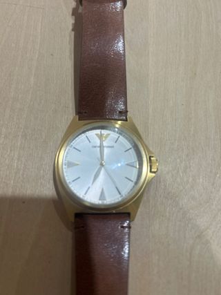 Elegante reloj Emporio Armani con detalles dorados y correa de piel. - Esfera clara y limpia. - Correa de piel marrón. - Caja de metal con acabado dorado.