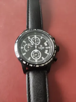 Elegante reloj de pulsera de la marca Racer con diseño cronógrafo, modelo R100. - Esfera negra intacta. - Correa de piel antialérgica negra (algo desgastada). - WR 50 M. - Movimiento Japonés Citizen OS10. - Taquímetro. - Cristal mineral reforzado. - Marca grabada en: Esfera, Tapa, Correa, Hebilla. - Anagrama Racer en: Esfera, Corona, Segundero, Correa. - Diámetro: 45 mm. **SIN CAJA** **SIN PILA**