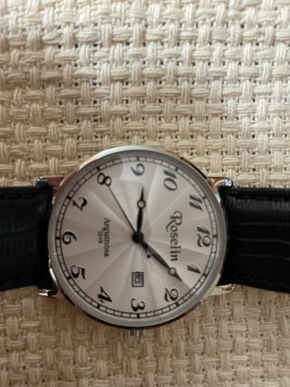 Elegante reloj de caballero de la marca Roselin, sin estrenar. - Esfera plateada con detalles. - Correa de piel negra. - Cierre de hebilla.