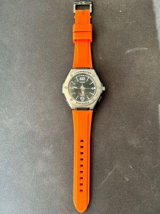 Reloj Casio MWA-100H en color naranja y plateado. Se encuentra en buen estado. - Correa de silicona naranja. - Pilas recién cambiadas (lleva 2) - Resistente al agua (WR 100M). - Iluminador.