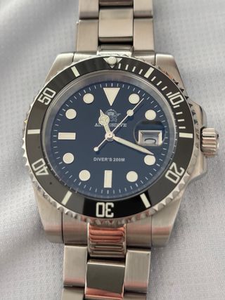 Reloj de pulsera con esfera azul y detalles plateados. - Bisel giratorio negro. - Correa de metal. - Resistente al agua 200m.
