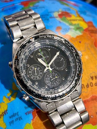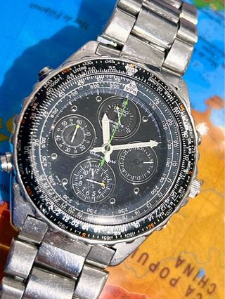 Reloj Seiko con cronógrafo y detalles en plata. Un accesorio llamativo y funcional,estilo piloto,con cronografo,alarma, cambio de fecha rapido,brazalete original,funcionamiento perfecto, Mas relojes en mi perfil - Esfera negra. - Correa de metal plateada. - Diseño deportivo y elegante. - Mas relojes en mi perfil