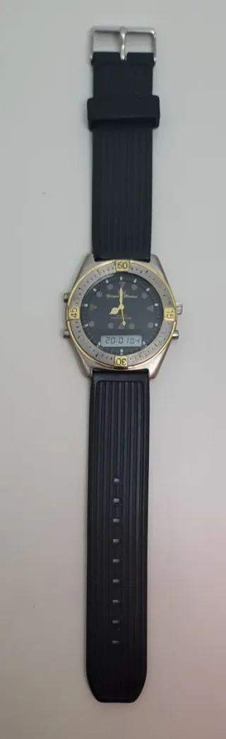 Reloj Yonger & Bresson con diseño anadigi. Vintage. Años 80. Diseño francés. Maquinaria Miyota japonesa. - Correa de caucho negra. - Bisel con detalles dorados. - Esfera combinada analógica y digital. Buen estado. Funcionando. Con Luz. Hora, fecha, alarma, cronómetro. Muy buen estado para los años que tiene. Se vende tal como esta. No se aceptan devoluciones.