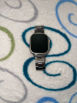 Reloj inteligente con un diseño moderno y elegante. - Correa de metal plateada. - Esfera negra.