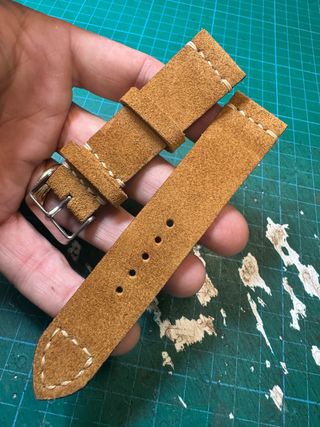 Correa de reloj hecha a mano en nobuck color marrón Tank. - Material: nobuck. - Hebilla metálica plateada. - Capa inferior en piel vacuna de alta calidad. - Costuras a mano en hilo encerado de 0,6mm de grosor. - Medidas 24x22mm, 115x75mm.