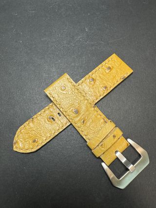 Correa de reloj hecha a mano en piel vacuna marcada a avestruz. - Material: Piel con textura. - Hebilla metálica plateada. - Capa inferior en forro vacuno de alta calidad. - Costuras a mano en hilo encerado de 0,6mm de grosor. - Medidas 24x24mm, 120x75mm.