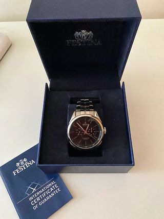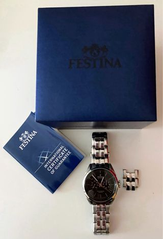 Elegante reloj Festina para hombre. Se entrega en su caja original junto con el certificado de garantía internacional. - Diseño moderno y sofisticado. - Caja y correa de acero inoxidable. - Esfera oscura con detalles plateados. Como nuevo, sin uso Sin pilas
