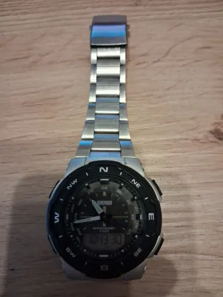 Reloj deportivo con diseño moderno y funcional. - Esfera con indicadores de brújula y hora digital. - Correa de metal plateada. - Resistente al agua.