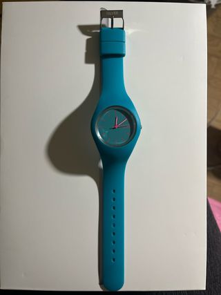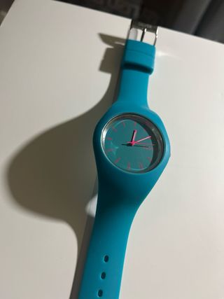 Reloj de pulsera con un diseño moderno y llamativo. - Correa de silicona en color azul. - Esfera en tono azul con manecillas rosas. - Hebilla metálica plateada con el logo 'SILVER'.