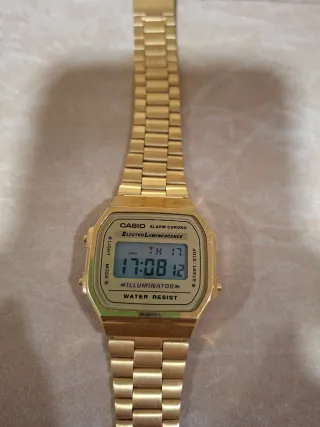 Reloj Casio modelo A168 con un acabado dorado. - Diseño clásico y atemporal. - Correa metálica ajustable. - Resistente al agua 30m. - Caja en resina cromada con acabado en dorado. - parte trasera acero inoxidable. - Luz fondo electroluminiscente. - Alarma diaria. - Cronómetro. - Calendario automático.