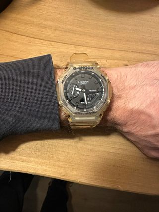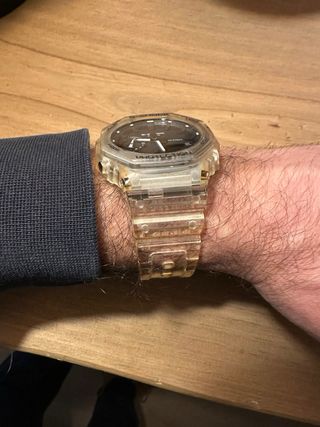 Este reloj G-Shock presenta un diseño skeleton con una correa y caja transparentes. Se muestran pequeñas marcas de uso. - Caja y correa de resina transparente. - Esfera con detalles skeleton. - Caja y papeles