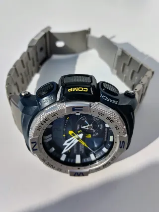 Envío GRATUITO en España!* NO envío a través de Wallapop. Gran reloj todoterreno Casio PRO TREK en excelente estado (cómo nuevo), parte de mi colección. Con brújula, termómetro, cronometro, 5 alarmas, señal horaria, luz automática etc. Resistente al agua 20 ATM. Funciona todo sin problemas. Sé ha mejorado con una pulsera de TITANIO, perfectamente compatible (sin adaptadores de resina), tal y cómo sé puede ver en las fotos. Es una pulsera nueva, completa. Se entrega en una caja Casio Wrist original (ultima foto). El Manual de Usuario se puede descargar gratis de Internet. *Envío certificado por Correos, pago por Bizum.