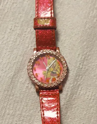 Precioso reloj de pulsera de la marca Bratz con un diseño llamativo. - Correa brillante en color rosa. - Esfera con detalles en dorado y dibujo. - Bisel adornado con pequeñas piedras.