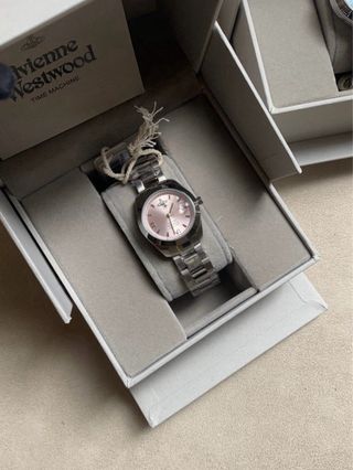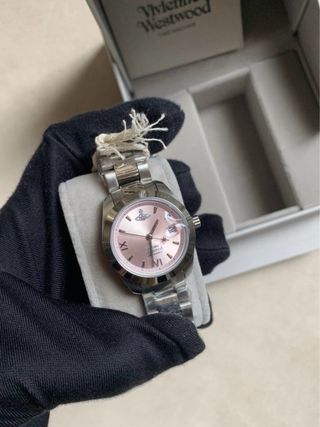 Elegante reloj de la marca Vivienne Westwood con una esfera en tono rosa y detalles plateados. - Diseño moderno y sofisticado. - Correa de eslabones plateada.