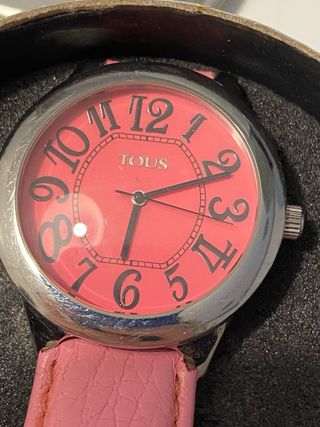 Reloj de la marca Tous con un diseño llamativo. - Esfera de color rosa. - Correa de piel rosa. - Detalles plateados en la caja.