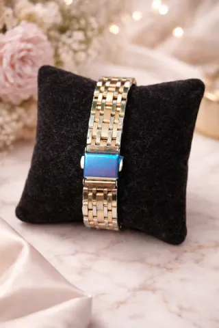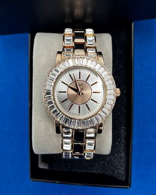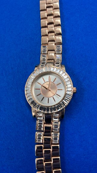 Precioso reloj Next de mujer con acabado oro rosa y cristales tipo joyería. ✨ CARACTERÍSTICAS: • Marca: Next (UK) • Estilo: Fashion/cocktail watch • Bisel con cristales baguette • Esfera champagne con índices dorados • Brazalete dorado con cristales • Movimiento cuarzo • Estado excelente IDEAL PARA: Ocasiones especiales, look glamuroso, regalo elegante Se entrega en caja negra original. Estilo similar a Michael Kors a precio accesible. ¡Dale brillo a tu muñeca! - Bisel adornado con cristales. - Correa de eslabones con detalles en negro.