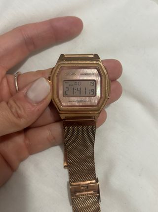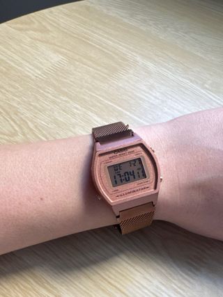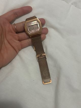 Reloj Casio con un diseño moderno y elegante en tono oro rosa. Su malla metálica le da un toque sofisticado. - Correa de malla ajustable. - Pantalla digital.