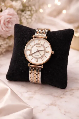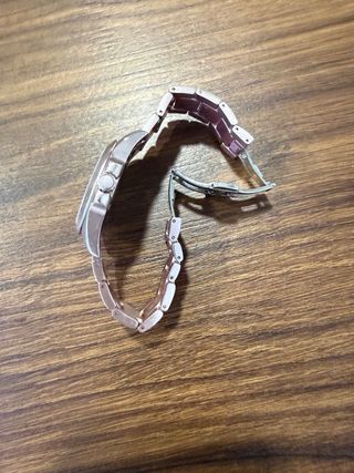 Elegante reloj con un diseño bicolor que combina oro rosa y plateado. Es un accesorio nuevo, listo para estrenar. - Esfera con detalles de pedrería. - Indicadores horarios romanos y de puntos. - Correa de eslabones metálicos.
