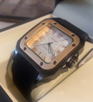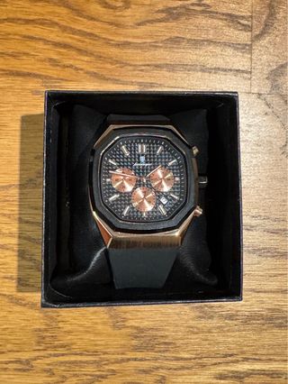 Reloj Cerruti 1881 Original Diseño robusto, elegante y deportivo con acabados premium en tonos café y oro rosa que destacan su diseño, ideal para hombres que buscan un estilo moderno y sofisticado en cualquier ocasión. Características: - Movimiento de alta precisión; Cronógrafo funcional, Indicador de fecha integrado con Correa de silicona cómoda y resistente. - Ancho de pulsera: 3.2 cms - Diámetro: 4.5 cms - Dimensión de la caja: 1.3 cms en Acero inoxidable. - Resistente al agua 10 ATM Incluye caja original, manual y documentos de autenticidad. (AI) Precio de Tienda 250€. 📦 Producto nuevo y original 🚚 Envío rápido y seguro