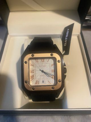 Elegante reloj Gatsby para hombre, con un diseño moderno y sofisticado. Perfecto para complementar cualquier atuendo. Regalo de reyes que no se pudo devolver - Correa de silicona negra. - Caja y bisel en tono dorado. - Esfera con números romanos. No se envia