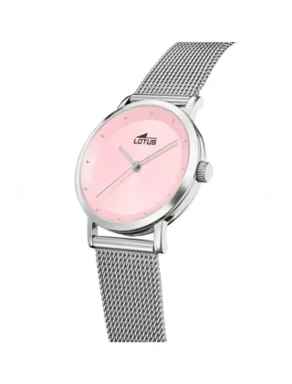 Elegante reloj Lotus con un diseño moderno y sofisticado. - Esfera de color rosa. - Correa de malla plateada. - Caja de acero inoxidable.