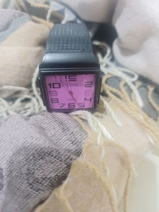 Reloj con diseño moderno y llamativo. - Correa de material sintético. - Esfera de color rosa vibrante. - Diseño cuadrado.