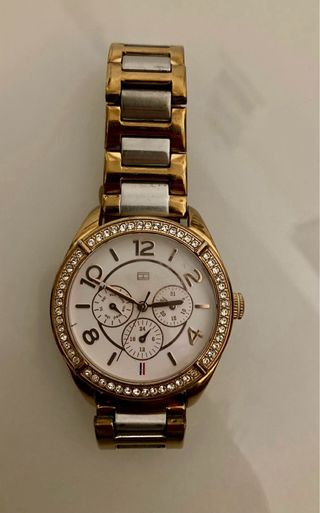 Elegante reloj Tommy Hilfiger con detalles en dorado y blanco. Un accesorio sofisticado para cualquier ocasión. - Bisel adornado con pedrería. - Esfera blanca con múltiples subesferas. - Correa de eslabones combinando plateado rosa y plateado
