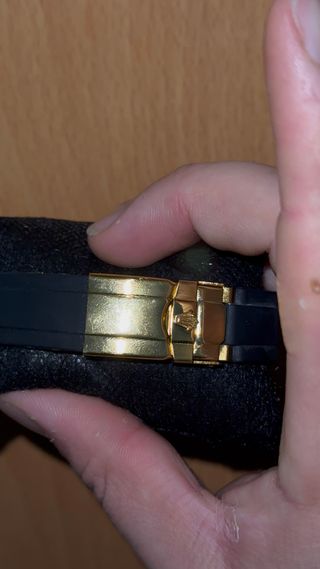 Elegante reloj Rolex Yacht-Master con detalles en oro y esfera negra. Un accesorio de lujo para cualquier ocasión. - Bisel con incrustaciones. - Correa de caucho negra.
