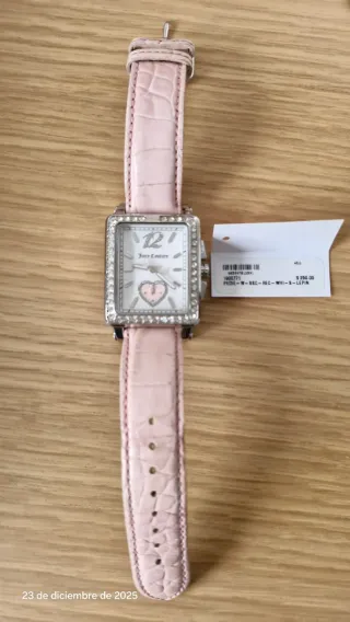 Elegante reloj Juicy Couture con correa rosa y con todos los detalles de cristales incluídos - Esfera Rectangular de 3x4 cm, con detalle de un corazón en el interior - Correa de piel en rosa con logo de Juicy Couture. es la que más se puede ver el uso, y por eso la piel interior tiene un color más oscuro. La caja marrón es la que está rota por un lado porque me era difícil encajarla con todo lo que incluye😞 PVP original 250$