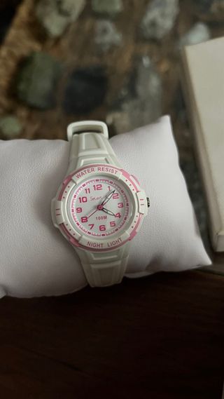 Reloj Casio con diseño redondo y correa en tono rosa. Es un accesorio llamativo y juvenil (yo diría que es para los más pequeños). Como detallito no está mal. - Esfera con números de colores. - Resistente al agua hasta 100 metros. - Lleva pila incluida para que veas que funciona. Lo entrego en una cajita (no de Casio).