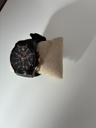 Reloj DUWARD Aquastar - Cronógrafo Negro y Oro Rosa ⌚ Vendo espectacular reloj Duward Aquastar en excelente estado. Un modelo que combina deportividad y elegancia con un diseño robusto y acabados de alta calidad. Diseño: Esfera negra con detalles, índices y agujas en contraste oro rosa. Funciones: Cronógrafo de precisión y ventana de fecha situada a las 6. Caja: Acabado negro mate con tornillería decorativa en oro rosa en el bisel. Correa: Silicona negra de alta resistencia, muy cómoda para el día a día. Estado: Muy bien cuidado y funcionando perfectamente. ⚠️ ENVÍO: Solo acepto venta mediante envío seguro a través de la plataforma
