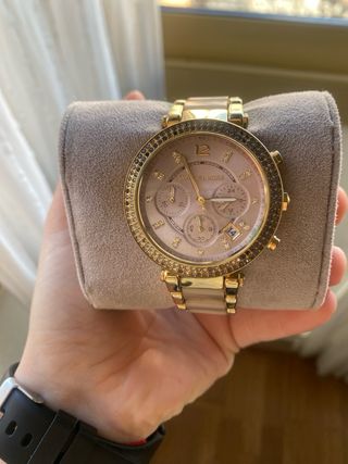 Vendo Michael Kors Parker referencia MK6326, de mujer en acero dorado con bisel engastado de cristalitos y cronógrafo + fecha Funciona correctamente (la última vez que se cambió la pila iba perfecto). Hay algún cristalito/s faltante o pequeño desgaste en el bisel. La caja original la incluyo, aunque está algo desgastada por el uso, útil para guardarlo. - Acero con acabado dorado, tamaño mediano (≈39 mm).  - Bisel con cristales decorativo (faltan algunos) -Esfera champagne con subesferas de cronógrafo y ventana de fecha.  -Movimiento de cuarzo (batería) y resistente al agua leve (aprox. 5 ATM). -Cierre pulsador, correa 16cm