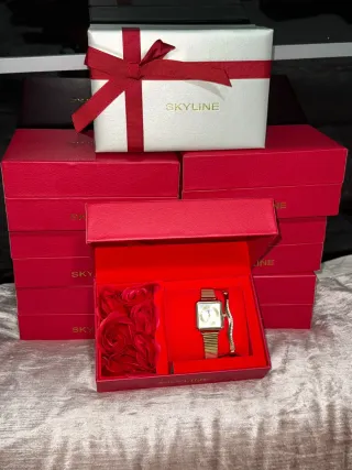 Hermoso Set de Regalo: Reloj Skyline + Pulsera y Rosas! precioso set de regalo Skyline, A estrenar!! en su caja original. Es el detalle perfecto para un aniversario, cumpleaños o fecha especial. El set incluye: ⌚ Reloj elegante: Con correa de malla plateada (tipo milanesa), bisel rodeado de brillantes y esfera en tono rosa pálido con un precioso diseño de rosa dorada. Incluye fechador. 💎 Pulsera a juego inoxidable plateada y decorada con cristales que combinan perfectamente con el reloj. 🎁 Presentación de lujo: Viene en un estuche rojo aterciopelado con almohadilla y una decoración de rosas rojas artificiales a un lado.