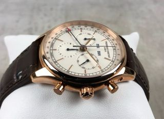 Elegante reloj Frédérique Constant con movimiento de cuarzo y función de cronógrafo. Su diseño combina detalles en oro y blanco, ofreciendo un estilo sofisticado. - Esfera blanca con índices y manecillas en tono dorado. - Función de cronógrafo con subesferas. - Correa de piel marrón. - Caja de acero inoxidable con acabado en oro rosa.