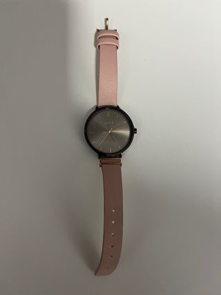 Elegante reloj de pulsera con correa de cuero rosa y detalles dorados. - Esfera blanca con marcadores horarios. - Correa de cuero con cierre de hebilla. - Diseño minimalista y moderno.