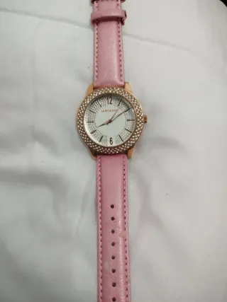 Elegante reloj de pulsera con correa rosa y detalles dorados. Esfera en perfecto estado y correa desgastada - Esfera blanca con números y manecillas doradas. - Bisel adornado con pedrería. - Correa de piel sintética. - Cierre de hebilla.