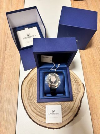 Reloj Swarovski a estrenar modelo 5095484, de la colección Octea Clássica con correa de cuero negra, caja en tono oro rosa y cristales. • Caja de acero inoxidable. • Bisel de cerámica negra. • Esfera negra con agujas en tono oro rosa e índices horarios en tono oro rosa. • Cristales decorativos. • Movimiento de cuarzo. • Cristal de zafiro. • Caja de 39 mm x 39 mm x 7 mm. • Ancho de la correa: 22 mm. • Resistencia al agua: 30 metros. Se vende con la caja original como se puede ver en las fotos, con las instrucciones y cuidados.