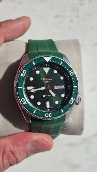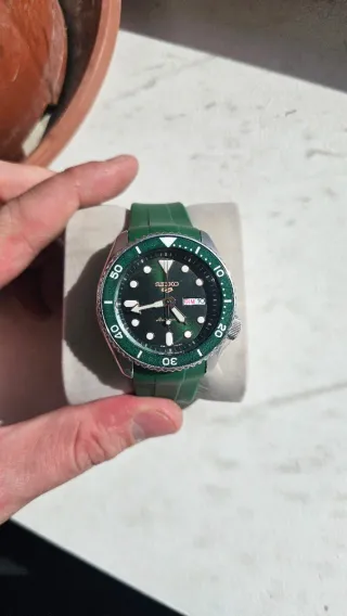 Reloj Seiko 5 con una llamativa combinación de colores verde y oro rosa. Su diseño moderno lo hace ideal para cualquier ocasión. - Correa de silicona verde. - Bisel giratorio verde. - Esfera verde con detalles en oro rosa. - Indicador de día y fecha. Se venden por falta de uso, se entrega con caja y correa original.