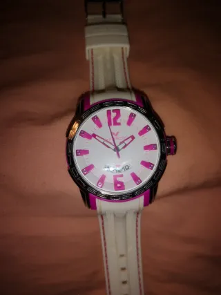 Reloj de la marca Viceroy con un diseño moderno y llamativo. - Correa de silicona blanca. - Detalles en color rosa vibrante. - Esfera blanca con marcadores y manecillas en rosa. - Bisel con detalles en negro y rosa.