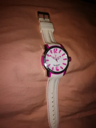 Reloj de la marca Marea para niña, en color rosa y blanco. Se encuentra sin uso. - Esfera blanca con números. - Correa de silicona rosa. - Resistente al agua 10 ATM.