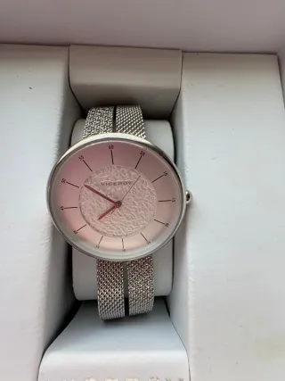 Elegante reloj Viceroy para mujer con un diseño moderno y sofisticado, que tiene la siguiente descripción: - Esfera en tono rosa. - Correa de malla plateada. - Caja-estuche del reloj. Se ve de porque no se ha utilizado desde su adquisición hace 05 años y por ello tiene un estado impecable, únicamente precisaría una pila, nada más.