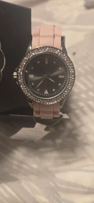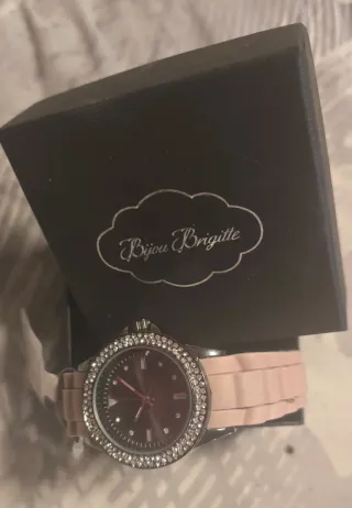 Reloj de la marca Bijou Brigitte, a estrenar. - Esfera en color negro. - Bisel adornado con pedrería. - Correa de silicona en tono rosa. - Detalles plateados en la esfera. - No tiene pila incluida