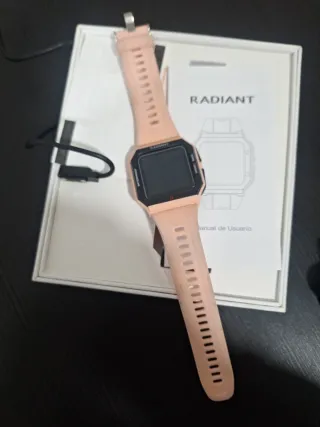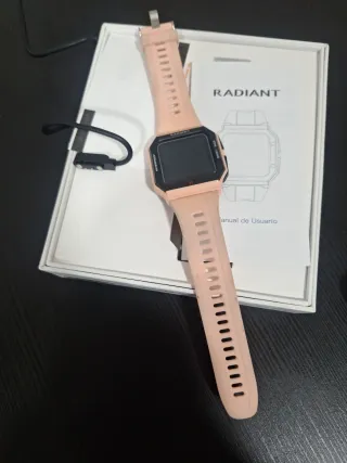 Reloj inteligente Radiant con correa rosa. - Resistente al agua. - Diseño moderno y funcional.